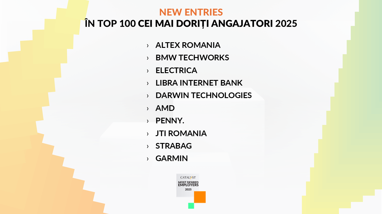 Pe lângă Top 100 Cei mai doriți angajatori, ediția din acest an aduce două noutăți importante: Top New Entry și, în premieră, Top Great Company Culture. Top New Entry evidențiază companiile care au intrat pentru prima dată în top 100 Cei mai doriți angajatori, organizații care au reușit să atragă atenția prin practici de management, cultură organizațională sau beneficii oferite angajaților și astfel să se poziționeze ca un angajator de top în România.