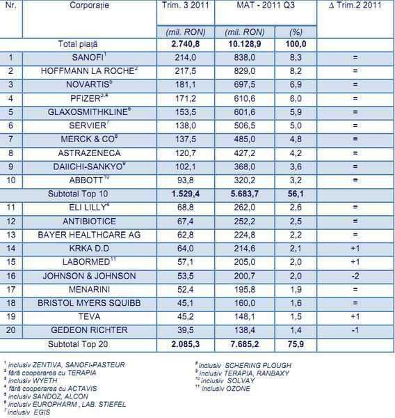 Astfel, topul este condus de Sanofi (Franta), care a raportat in perioada mentionata (oct. 2010 - sept. 2011) vanzari de 838 milioane de lei si o cota de piata de 8,3%. Pe locul al doilea se situeaza Hofmann La Roche (Elvetia), cu incasari de 829 milioane de lei si o cota de piata de 8,2%. Novartis se claseaza pe cea de-a treia pozitie, cu vanzari de 697,5 milioane de lei si o cota de piata de 6,9%.