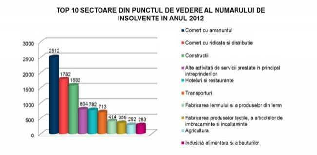 Pentru al treilea an consecutiv, primele zece sectoare care inregistreaza cel mai mare numar al firmelor aflate in insolventa raman neschimbate, singurele modificari fiind la nivel de ordine in cadrul topului, dar cu variatii de una, maxim doua pozitii. Astfel, daca in anul 2010, „Comertul cu amanuntul” inregistra un numar comparabil de insolvente cu sectorul „Comertul cu Ridicata si Distributie”, in ultimii doi ani, „Comertul cu amanuntul” s-a detasat, inregistrand 2.512 de insolvente nou deschise in prímele noua luni ale anului curent.