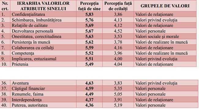 Astfel, surprinzator sau nu, exista un decalaj mare intre valorile atribuite de romani propriei persoane versus cele atribuite altor persoane, asa cum spune Dorin Bodea, autorul cartii "Valorile Angajatilor Romani".