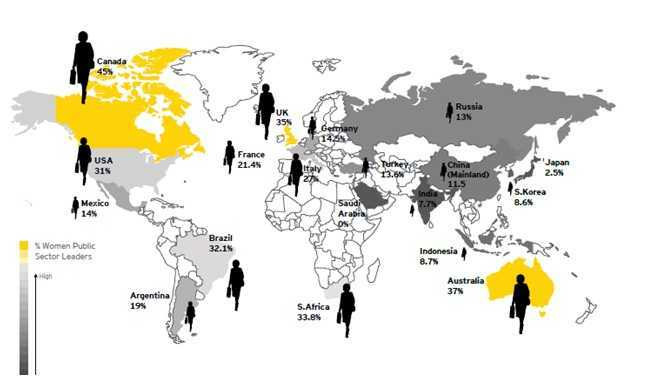 Dar, chiar si in tara care s-a clasat pe locul intai, Canada, femeile reprezinta doar 45% din liderii sectorului public. In Japonia, a treia economie din lume, femeile reprezinta sub 2,5% din lideri din sectorul public iar in India, doar 7,7%. In Arabia Saudita, cifra este zero.