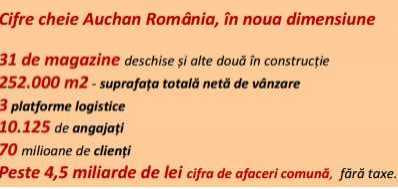 Auchan Romania, in noua sa dimensiune, ajunge la 31 de magazine deschise si alte doua in constructie, o suprafata neta de vanzare de 252.000 mp, peste 10.000 de angajati, 3 platforme logistice, 70 milioane de clienti anual si o cifra de afaceri comuna de peste 4,5 miliarde de lei, fara taxe. Compania devine, astfel, unul din primii cinci cei mai mari angajatori privati din Romania si a doua retea de comert, ca suprafata totala de vanzare la nivel national.