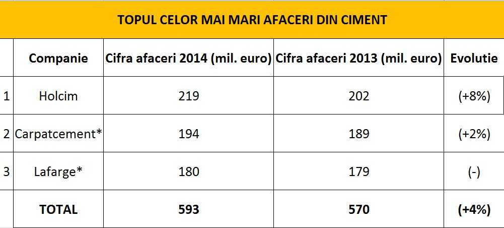 *Afacerile celor mai mari producatori de ciment la nivel local se bazeaza pe rezultatele declarate de catre cele trei companii la Ministerul de Finante pe parcursul anului 2014;