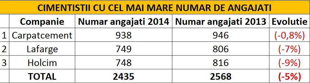 Din analiza wall-street.ro mai reiese faptul ca in top 3 al celor mai mari producatori de ciment la nivel local numarul de angajati s-a redus cu circa 5% in 2014.