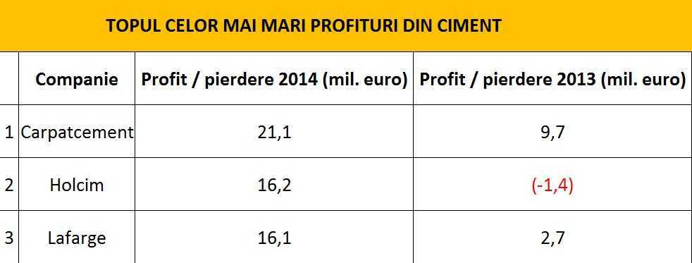 Lafarge pierde in acest fel titlul de cea mai profitabila companie producatoare de ciment, betoane si agregate la nivel local in detrimentul Carpatcement, companie in spatele careia se afla grupul german Heidelbergcement.