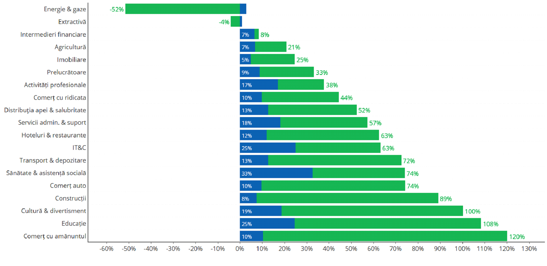 Constructiile au urcat pe locul 2 in acest an, inlocuind practic comertul cu ridicata aflat la 8.1% la sfarsitul lui 2017. Desi este bine situat din punct de vedere al profitabilitatii, prezinta si cele mai mari pierderi, fiind o industrie cu un grad ridicat de risc. IT&C se mentine pe locul 3, in usoara crestere, de la 7.4%, completeaza, Adina China-Birta.