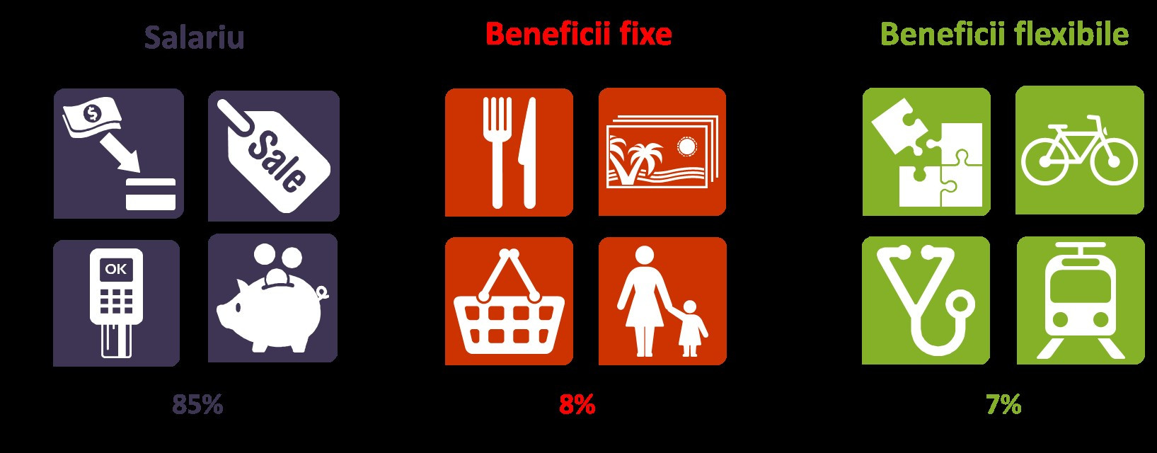 Restul de 15% din venit este reprezentat de beneficiile extra-salariale,a iar cele mai întâlnite astfel de beneficii sunt tichetele de masă și abonamentele medicale. Acestea e se bucură de o adopție de 2.5 milioane de beneficiari, în cazul tichetelor de masă, respectiv 1.6 milioane de beneficiari de abonament medical.