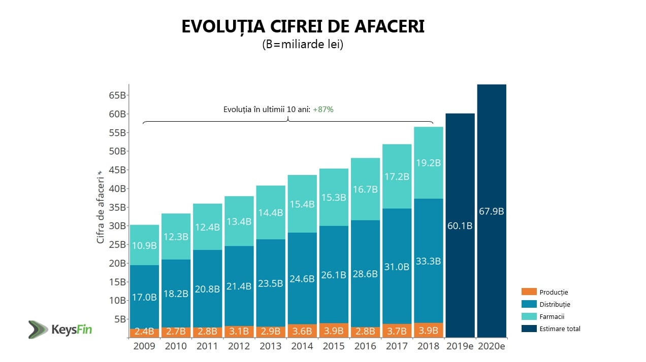 Profitul net al companiilor din industria farmaceutică a ajuns la aproape 3 miliarde de lei în 2018, cu 20% mai mare comparativ cu anul 2017 și cu 162% peste nivelul din 2009. Pentru 2019, analiștii KeysFin estimează depășirea nivelului de 3,25 miliarde de lei, iar, în ceea ce privește anul în curs, profitul net se va apropia de 4 miliarde de lei, potrivit acelorași estimări.