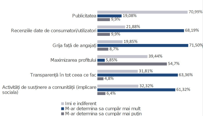 Mai mult, majoritatea respondenților (61,32%) afirmă că activitățile de implicare în comunități i-ar determina să achiziționeze produse din portofoliul companiilor implicate. Grija pentru angajați și transparența se numără de asemenea printre factorii pe care consumatorii îi iau în considerare în deciziile de achiziție. Peste 70% dintre consumatori declară că publicitatea nu le mai influențează deciziile de consum.