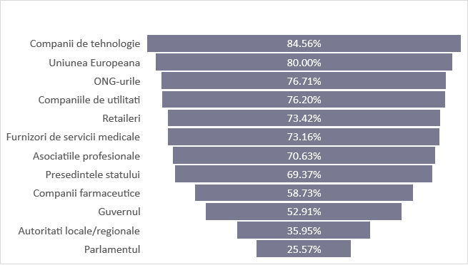 Cele mai bine clasate companii în topul încrederii consumatorilor români în ceea ce privește gestionarea crizei COVID-19 sunt companiile de tehnologie (84,5%) și companiile de retail (74%). Companiile farmaceutice se află pe o poziție inferioară, doar 58% din respondenți considerând că Big Pharma a răspuns eficient în situația actuală.