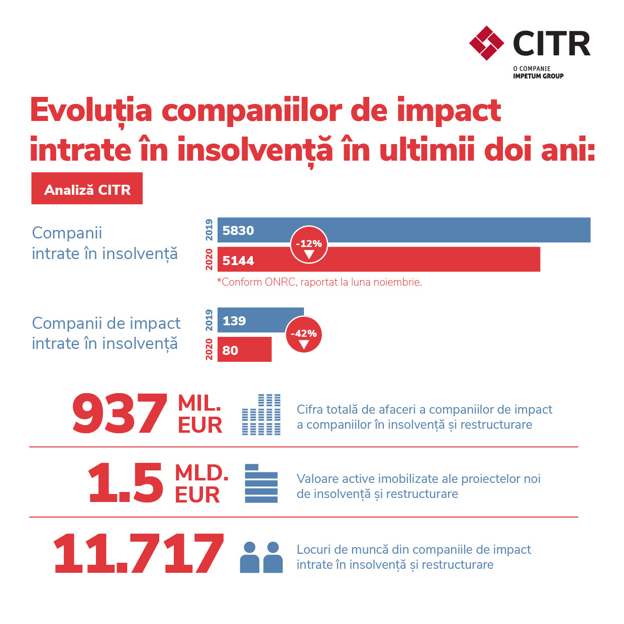 Facilitățile fiscale și închiderea tribunalelor în pandemie au făcut să scadă cu 42% numărul companiilor de impact care au accesat insolvența (de la 139 în 2019 la 80 în 2020), conform unei analize făcute de CITR, parte din Impetum Group. Cu toate acestea, impactul economic al proiectelor de insolvență și restructurarea au fost în creștere: valoarea activelor acestor companii este de 1,5 mld. de euro, cu 28% mai mare decât în anul 2019, iar numărul total de locuri de muncă afectate este de 11.717. De asemenea, aceste companii au o valoare a cifrei de afaceri de 937 mil. euro, cu 24% mai mult comparativ cu cifra anului 2019.