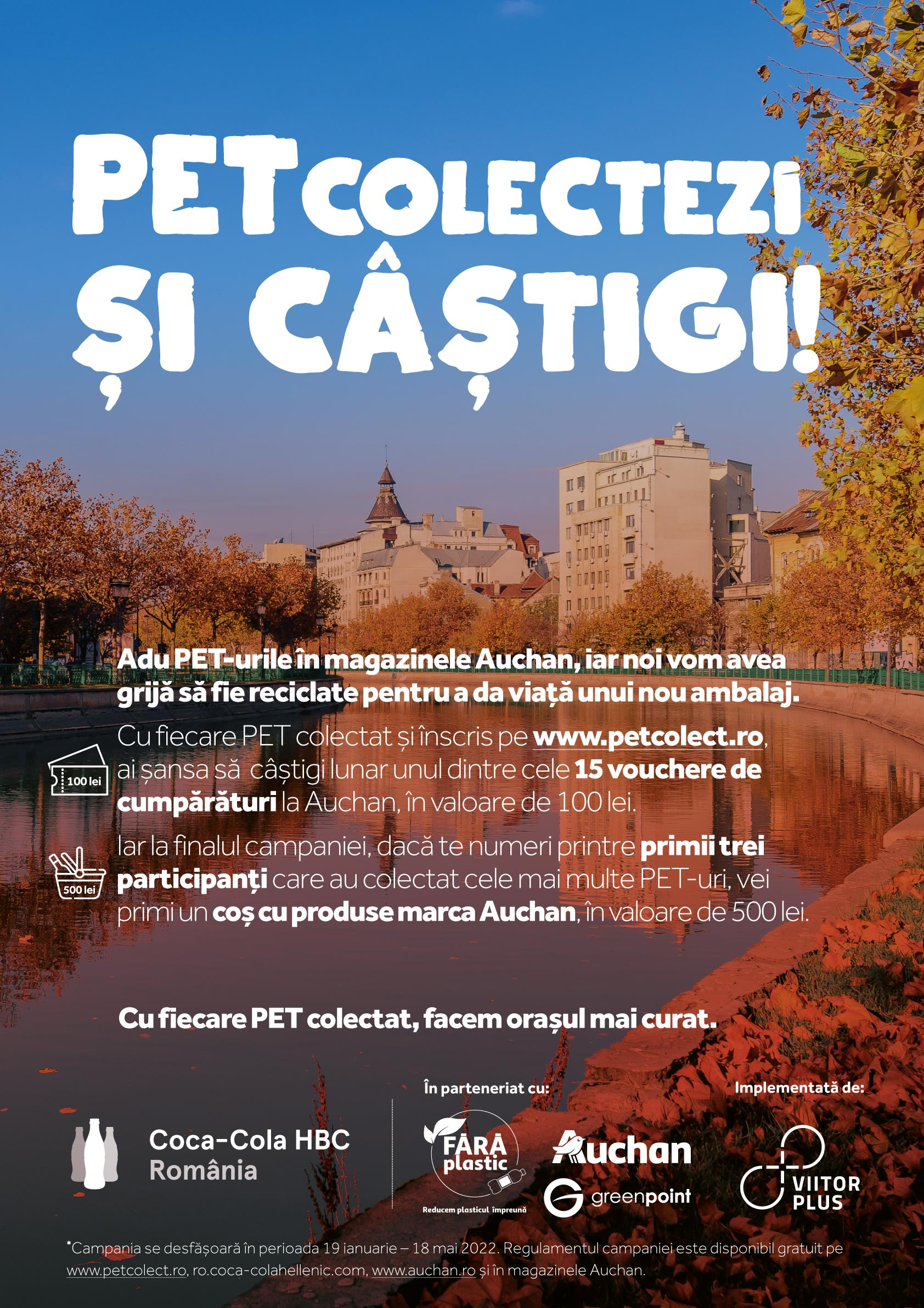 Campania, implementată de organizația non-profit Viitor Plus, invită consumatorii să colecteze ambalaje de plastic de tip PET în spațiile de colectare special amenajate în hipermarketurile și supermarketurile Auchan din toată țara.