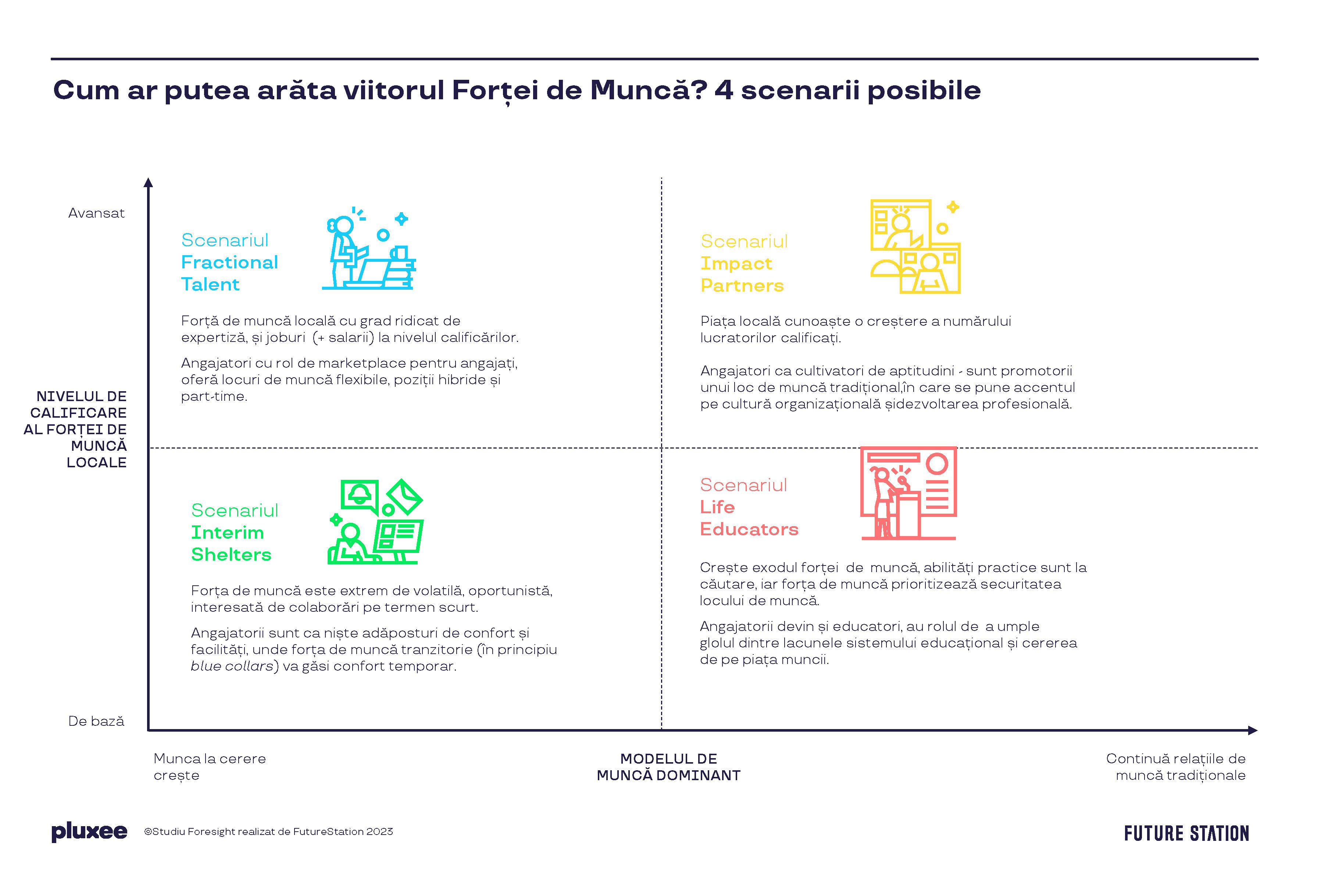 În acest context, am explorat 4 posibile scenarii de viitor pentru piața muncii din România, pornind de la premisa dominantă a muncii la cerere și analizând cum ar putea aceasta interacționa cu nivelurile variate de competențe locale, adaptarea sistemului educațional și politicile publice. Fiecare scenariu este însoțit de un artefact vizual și descrie cum ar putea arăta o ofertă de muncă într-un astfel de viitor. Aceste scenarii sunt menite să provoace o gamă largă de emoții, de la anxietate la uimire, reflectând incertitudinea și diversitatea posibilelor traiectorii ale pieței muncii. Scenariile nu sunt predicții definitive, ci mai degrabă exerciții de imaginație menite să pregătească forța de muncă și organizațiile pentru o varietate de posibile viitoruri.
