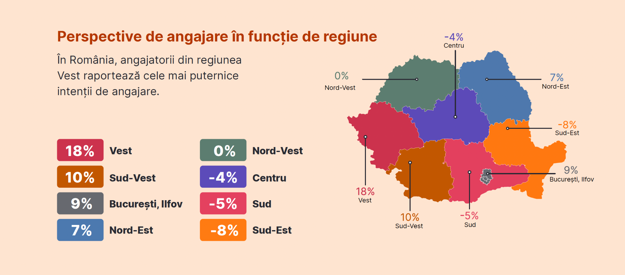 - Tendințe regionale de angajare: Angajatorii din regiunea de Vest a României raportează cele mai puternice intenții de angajare, cu alte tendințe pozitive în regiunile Sud-Vest și București & Ilfov. Regiunile Sud-Est și Sud au perspective negative în ceea ce privește intențiile de angajare.