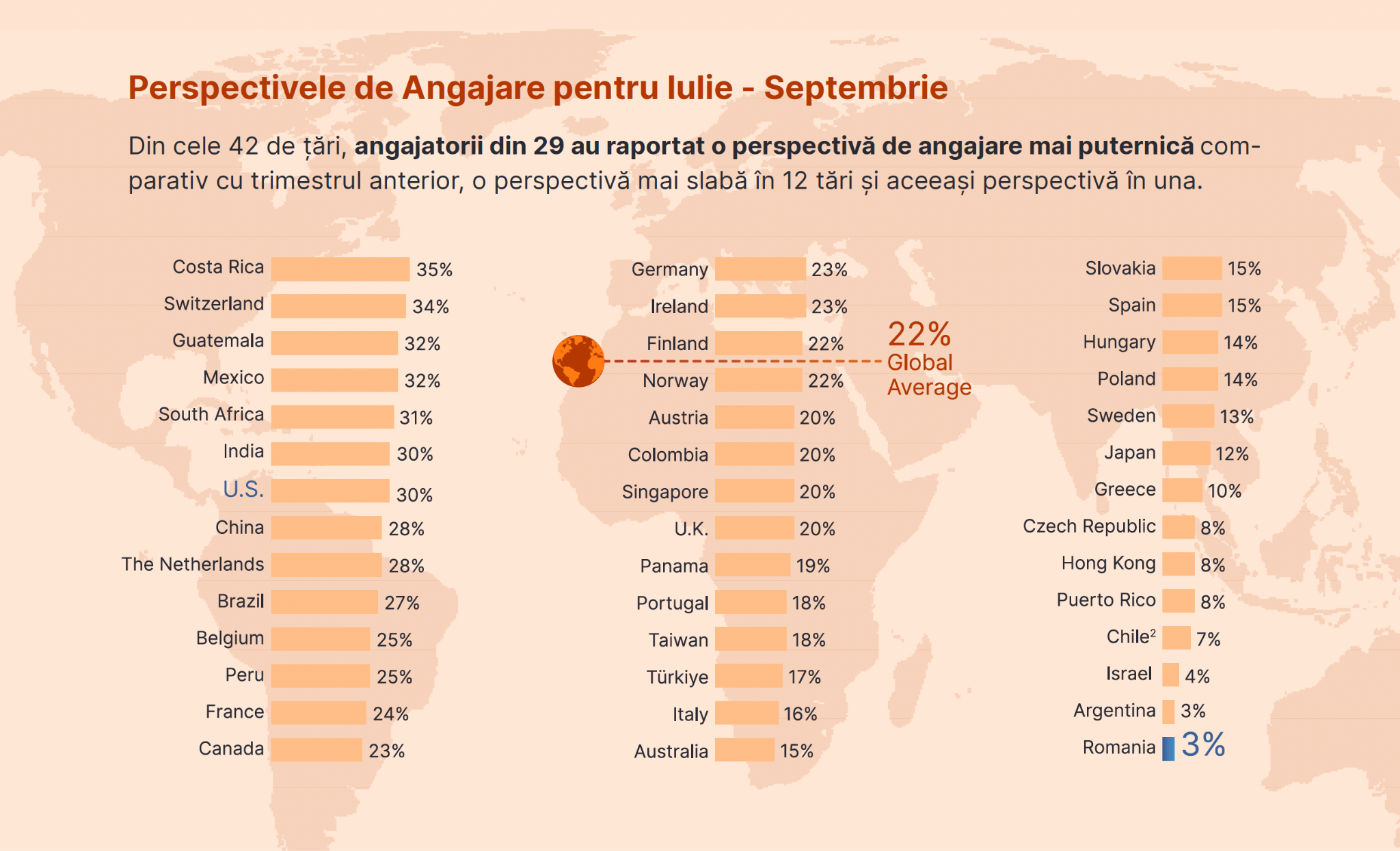 - Perspectiva Netă Globală rămâne neschimbată față de trimestrul trecut (22%). Cea mai puternică perspectivă de angajare este raportată de către angajatorii din Costa Rica (35%), în timp ce angajatorii din Argentina (3%) și România (3%) raportează cele mai slabe intenții de angajare.