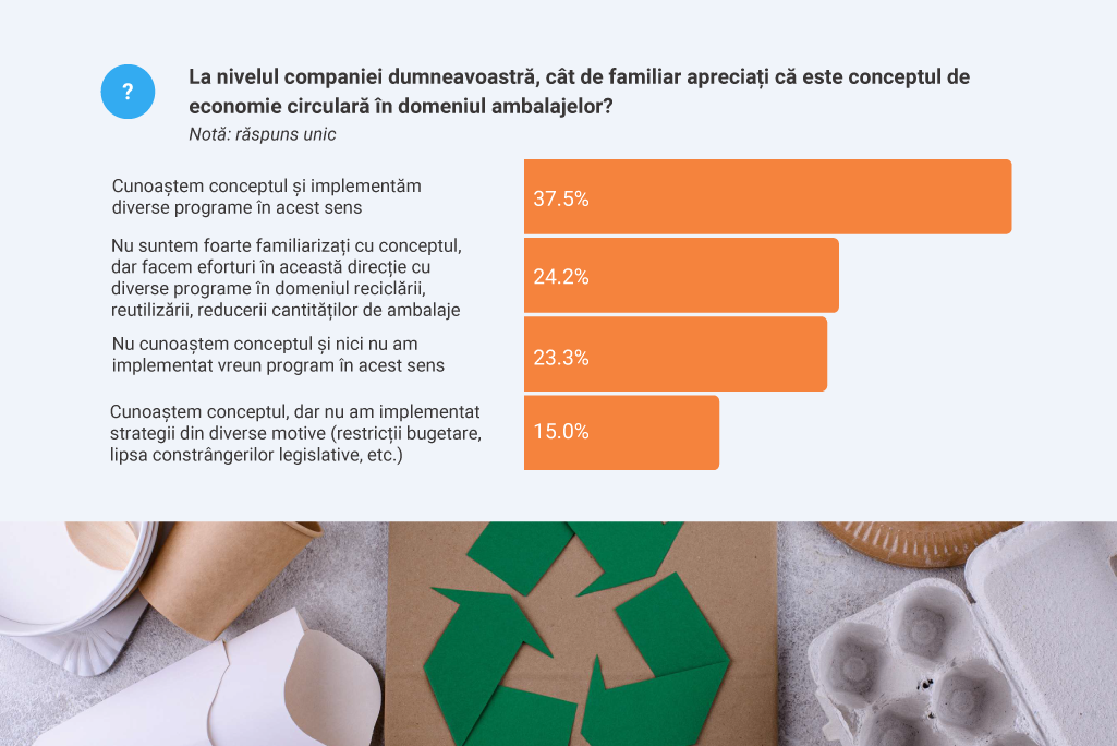 Potrivit studiului citat, circa 54,2% dintre companiile românești au o strategie de aplicare a principiilor economiei circulare pentru propriile ambalaje puse pe piață.