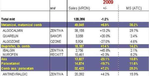 Conform datelor companiei de cercetari si analize de piata Cegedim Romania, segmentul reprezentat de ibuprofen (substanta activa contra durerilor si inflamatiilor - n. red.) a asigurat in perioada septembrie 2009 - august 2010 cea mai importanta crestere (+25% in valoare).