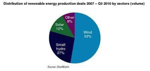 In perioada 2007 - septembrie 2010, mai bine de jumatate (53%) dintre deal-urile din piata productiei de energie verde din cele doua regiuni au vizat sectorul energiei eoliene. Centralele hidroelectrice mici si microcentralele hidroelectrice au avut o cota de 27%, respectiv 12% din totalul tranzactiilor, pe cand alte surse de energie regenerabile, precum biogazul sau energia geotermala, si-au adjudecat o cota de doar 8% in termeni de volum.