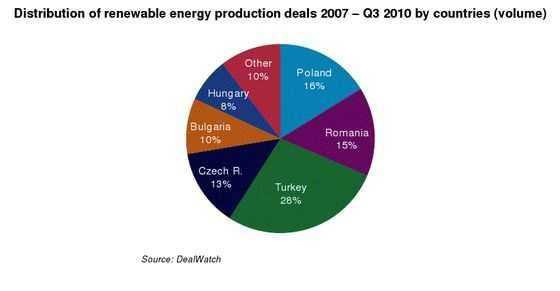 Potrivit studiului citat, in primele noua luni ale anului acesta, numarul tranzactiilor din M&A, in domeniul productiei de energie din surse regenerabile din regiunea Europei Central-Estice si Sud-Estice, a fost de aproximativ patru ori mai mare decat cel inregistrat in intreg anul 2007, ceea ce indica o rata anuala de crestere de 60%. In aceeasi perioada (ianuarie-septembrie 2010), valoarea totala a tranzactiilor a crescut de la 67 de milioane de euro la 363 de milioane de euro.