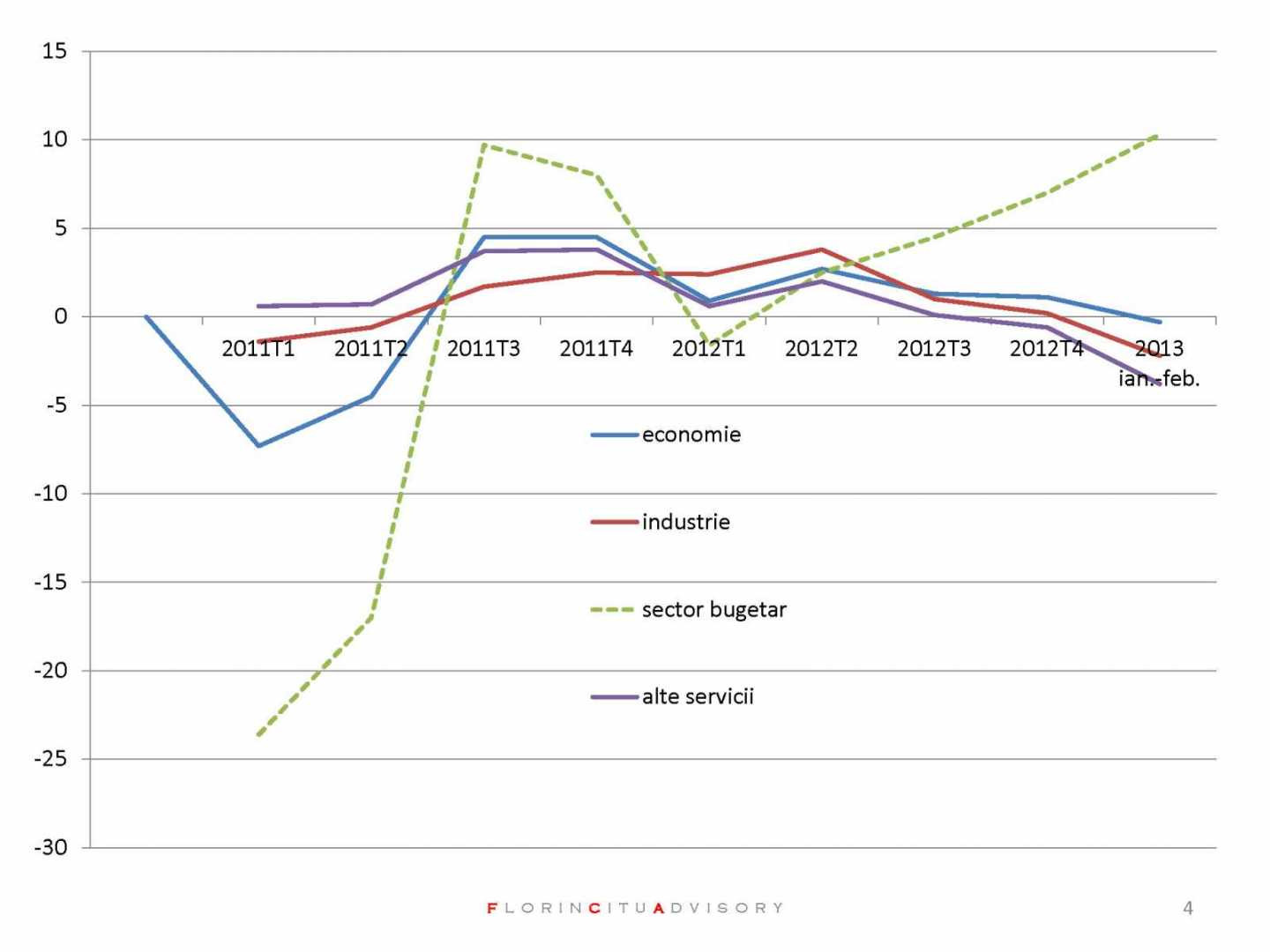 Din pacate singura dinamica pozitiva o vedem in rata anuala de crestere a salariului net real al angajatilor din sectorul bugetar. Este imposibil pentru o economie sa creasca si sa se dezvolte cand salariile reale (puterea de cumparare) din sectorul privat au o rata de crestere negativa in timp ce in sectorul bugetar observam o dinamica pozitiva.