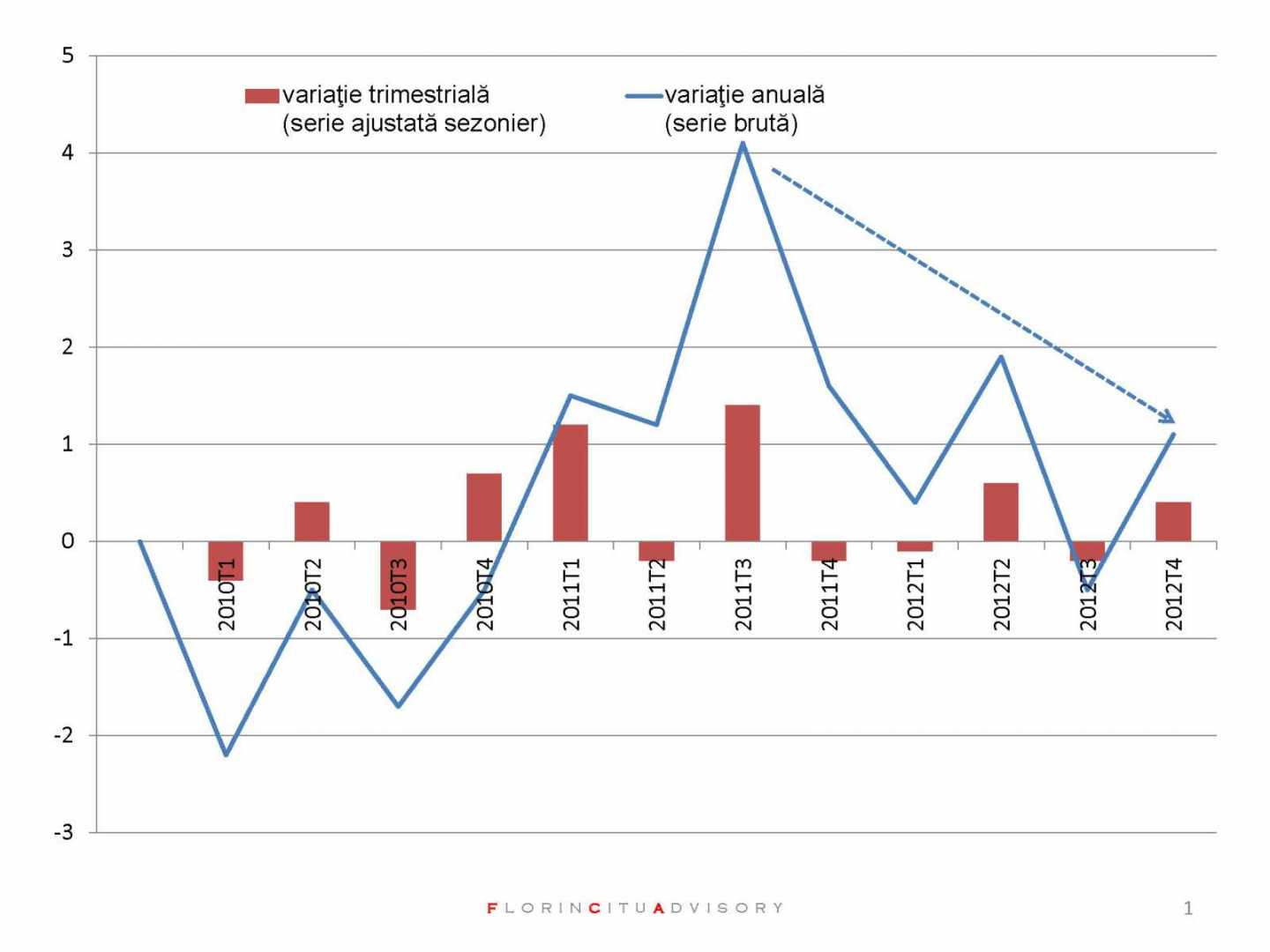 Pe grafic am inclus o sageata carea arata ca rata anuala de crestere a economiei a scazut constant din 2011 si pana in ultimul trimestru al lui 2012. Chiar daca au existat momente temporare de revenire tendinta este foarte clara, economia se stabilizeaza in jurul unei rate de crestere economica anuala de maxim 1%. Coincidenta sau nu este exact rata de crestere anuala medie reala pe care a obtinut-o Romania dinn 1990 si pana in 2012.