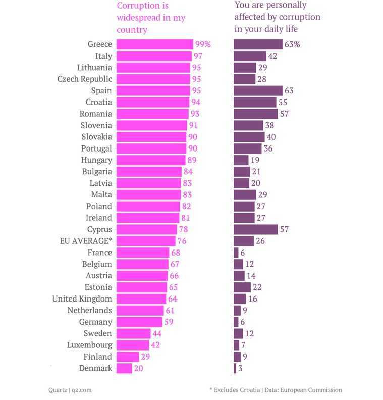 In cele mai multe tari din Europa de Vest conceptul de coruptie este unul destul de abstract la nivel personal (danezii sustin ca politicienii sunt cei mai corupti), insa, pe masura ce inaintezi spre sudul sau estul Europei, acest fenomen tinde sa faca parte din activitatea zilnica. Astfel, in ultimul an unul din trei lituanieni, respectiv unul din patru romani sustin ca li s-a cerut mita. Spre comparatie, media la nivel european este de un cetatean la 20.
