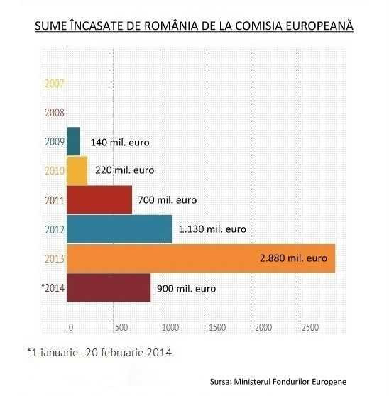 Romania a incasat joi, 20 februarie, 830 milioane euro de la Comisia Europeana din fonduri structurale si de coeziune, un record tinand cont ca este mai mare suma atrasa de Romania intr-o singura zi. Totodata, viramentul facut joi reprezinta aproape o treime din sumele atrase pe tot anul 2013.