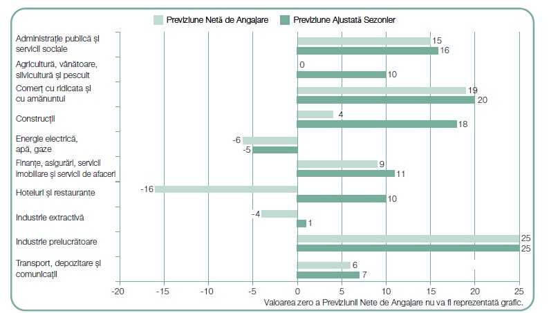 Cele mai dinamice piete ale fortei de munca sunt prognozate de catre angajatorii din sectorul Industrie Prelucratoare si din sectorul Comert cu ridicata si cu amanuntul, cu Previziuni Nete de Angajare de +25%, respectiv +20%.
