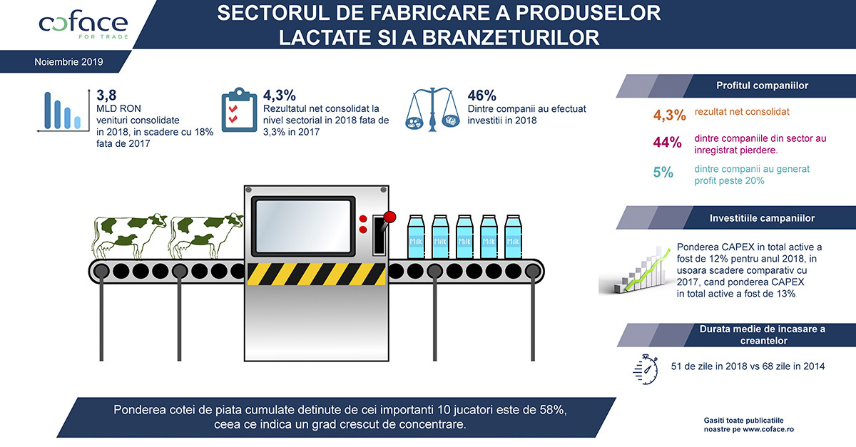 „Pe parcursul anului 2018, companiile din sectorul analizat au alocat investitii semnificative pentru extinderea activelor fixe. Raportul dintre cheltuielile cu capitalul (CAPEX) si amortizare a fost de 120% in 2018, ceea ce inseamna ca investitiile in activele fixe au acoperit mijloacele fixe amortizate. Aproape jumatate din companii (46%) au efectuat investitii in 2018, cu un raport Capex/Amortizare supraunitar. Mediul de afaceri din industria lactatelor incearca sa suplineasca lipsa investitiilor publice (70% din bugetul public fiind puternic orientat catre salarii si ajutoare sociale, maximul din istoria Romaniei si a UE), pentru a incerca sa faca fata concurentei. Din pacate, fara infrastructura publica este foarte greu, veniturile companiilor din acest sector scazand cu 18% in ultimul an, in timp ce importurile de lactate au crescut cu aproape 20%”, a declarat Nicoleta Marin, Senior Financial Analyst, Coface Romania.