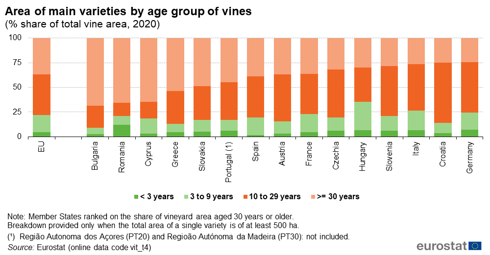 O altă problemă identificată de Eurostat în cazul României este vârsta plantelor de viță de vie: aproape două treimi au peste 30 de ani (față de o medie europeană de 36,7%). În plus, și replantarea este sub media europeană: doar 12% dintre plantele de la noi sunt mai tinere de 3 ani.