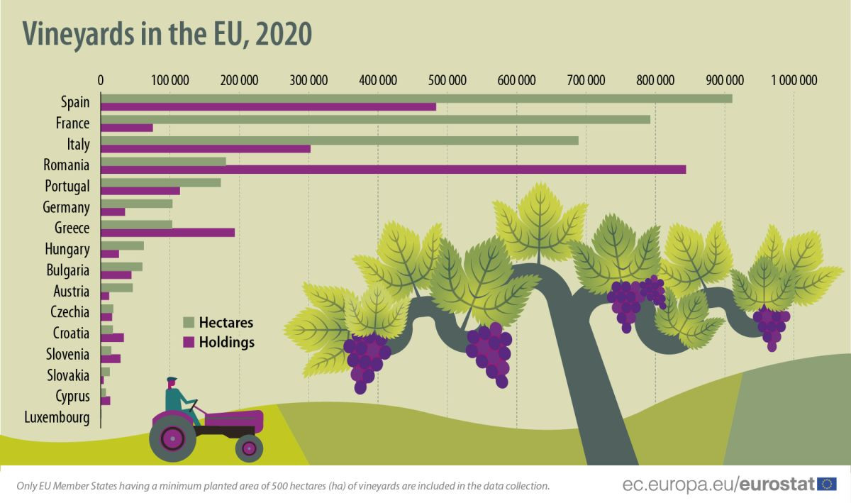 Uniunea Europeană avea, conform cele mai recente cifre Eurostat (adică la nivelul anului 2020) aproximativ 45% din regiunile viticole ale planetei. Din totalul de 3,2 milioane de hectare de vie din UE, aproape trei sferturi sunt în Spania, Franța și Italia.