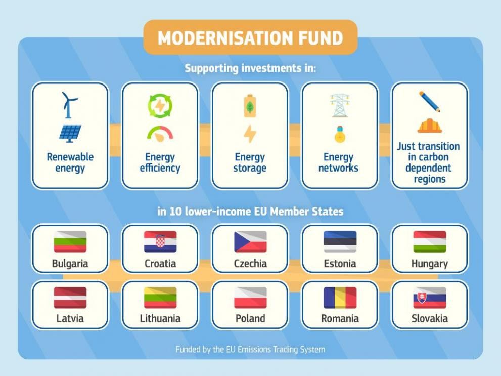 Finanţat din veniturile obţinute în urma licitării certificatelor de emisii din sistemul UE de comercializare a certificatelor de emisii, Fondul pentru modernizare urmăreşte să sprijine zece ţări din UE cu venituri mai mici în tranziţia lor către neutralitatea climatică, modernizându-le sectorul energetic şi sistemele energetice în sens mai larg, sporind eficienţa energetică şi facilitând o tranziţie echitabilă. Ţările beneficiare sunt Bulgaria, Cehia, Croaţia, Estonia, Letonia, Lituania, Polonia, România, Slovacia şi Ungaria.