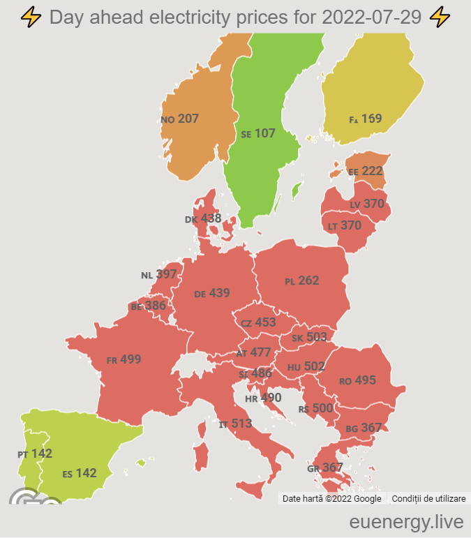 În contextul actual, prețul cel mai mare este cel al centralelor electrice pe bază de gaz, care este încontinuu tras în sus de scumpirea constantă a gazelor în ultimele luni. În România, însă, în jur de 10% din energia electrică este produsă în centrale pe gaz – comparativ cu Grecia sau Italia, unde procentul trece de 50%. Media europeană, în acest moment, este de 21%, conform Institutului Fraunhofer.