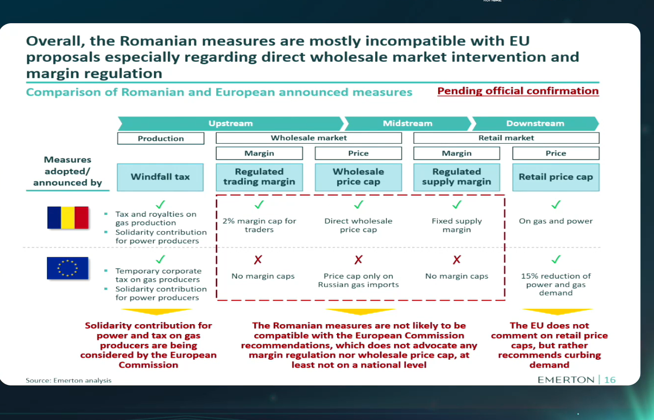 Analiștii Emerton au comparat măsurile adoptate de Guvernul României pe 1 septembrie și propunerile avansate câteva zile mai târziu de Comisia Europeană. Concluzia este că, în mare măsură, nu sunt compatibile. De pildă, CE nu susține intervenția pe piața angro sau plafonarea marjelor furnizorilor, iar ”windfall tax” (supraimpozitarea) trece de nivelul recomandat de la Bruxelles.