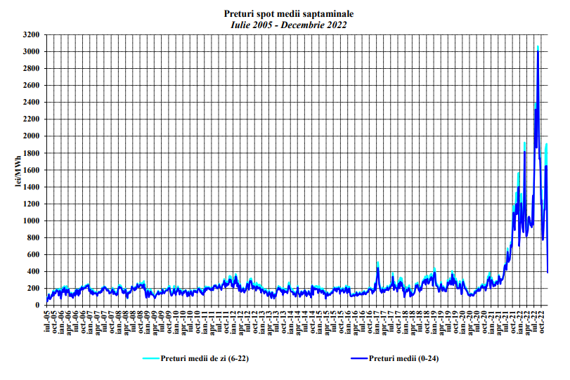 Ca termen de comparație, pe piața contractelor bilaterale prețul mediu al energiei era de 168 lei/MWh în 2020, de 388 lei/MWh în 2021 și de 1.000 lei/MWh în 2022. Pe piața pentru ziua următoare, prețul mediu a ajuns la 1.333 lei/MWh (539 în 2021, 196 în 2020) iar pe piața intrazilnică, la 1.329 lei/MWh (591 în 2021, 208 în 2020). Explozia efectivă a prețurilor pe piața spot, de unde cumpără marii consumatori, în anul care a trecut se poate vedea mai clar în acest grafic.