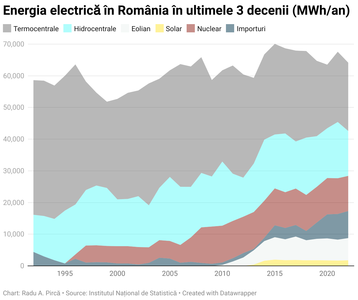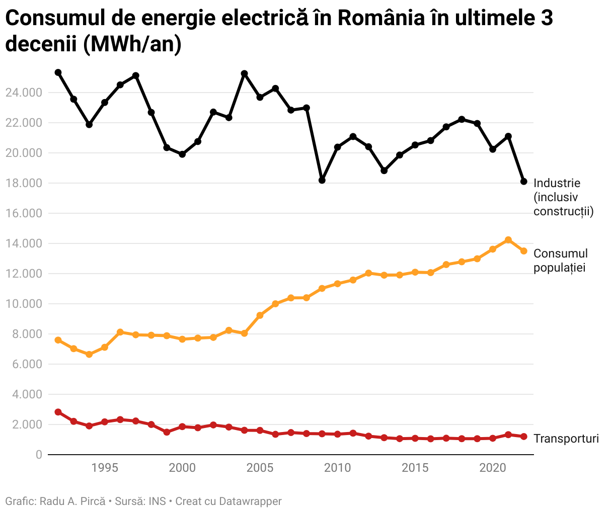 Între timp, consumul casnic s-a dublat, iar cel al industriei s-a redus cu aproape o cincime, deși PIB-ul României a crescut - practic, industria nu mai e energofagă, ca în perioada comunistă. Iar termocentralele clasice sunt pe cale să dispară.