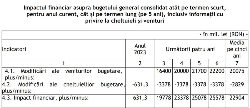 În acest an, efectul la bugetul de stat se va vedea vedea doar din prisma reducerii cheltuielilor bugetare, pentru că taxele noi şi majorările vor produce efecte abia din 2024, conform notei de fundamentare a proiectului. Impactul pe bugetul de anul acesta ar urma să fie de 630 milioane lei.