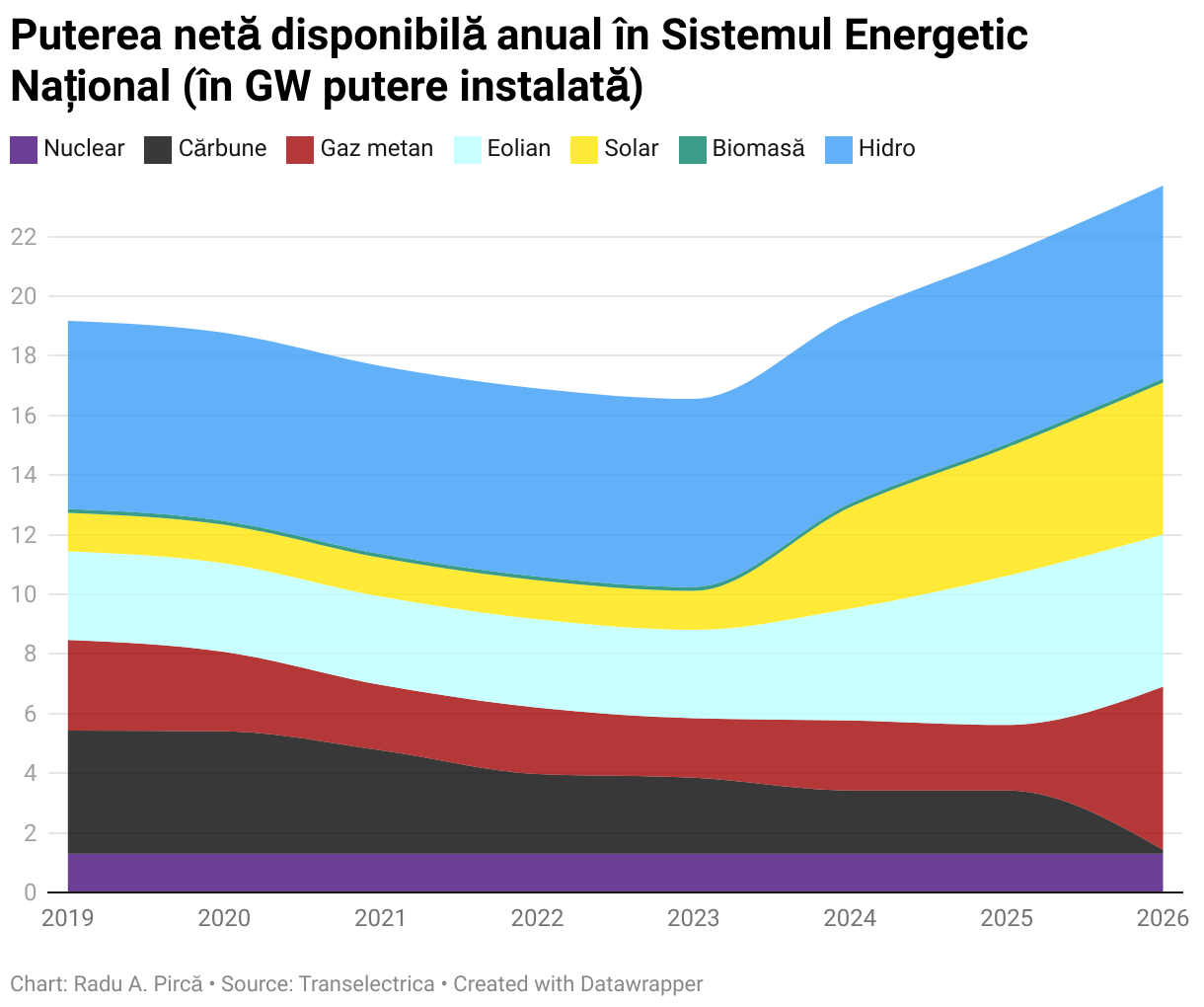 În infografic se poate vedea și evoluția fiecărui tip de capacitate de producere a energiei începând din 2019. Se poate remarca stagnarea regenerabilelor până momentul crizei energiei, când brusc ponderea acestora a devenit tot mai mare, dar și dispariția treptată a cărbunelui din producția de energie a României.