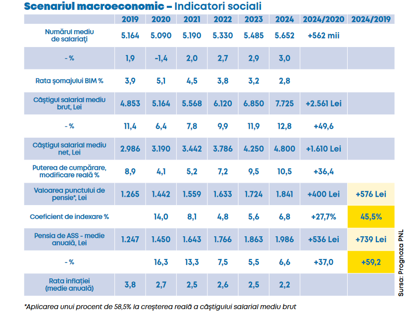 PNL, partidul care s-a aflat permanent la guvernare în ultimii patru ani, promitea în 2020 că măsurile economice pe care le va adopta vor duce indirect la o creștere a salariului mediu brut la 7.725 lei în 2024. Salariul mediu net promis era de 4.800 lei