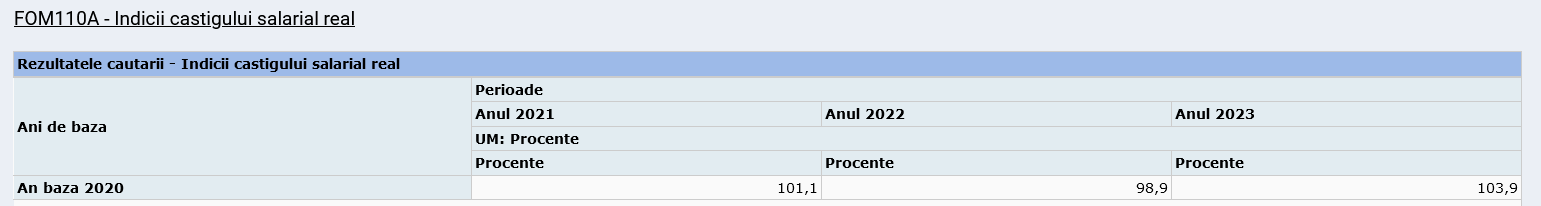 Institutul Național de Statistică (INS) calculează și un indice al câștigului salarial real*. Acesta arată practic cu cât a crescut sau scăzut puterea de cumpărare comparând două intervale de timp.