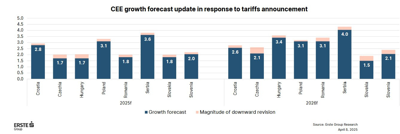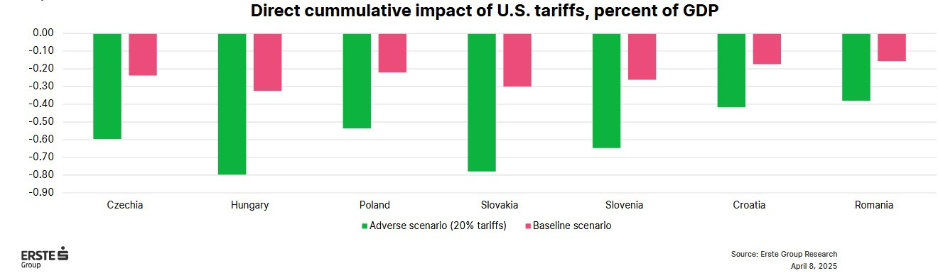„În scenariul de bază, impactul negativ al tarifelor rămâne moderat, între -0,3 și -0,2 puncte procentuale. Într-un scenariu nefavorabil, efectul negativ cumulat direct ajunge la -0,8 puncte procentuale, fiind cel mai puternic resimțit în Slovacia și Ungaria. Pe de altă parte, Croația și România sunt cel mai puțin afectate direct de tarifele impuse de SUA la nivel global”, se arată în analiza Erste.