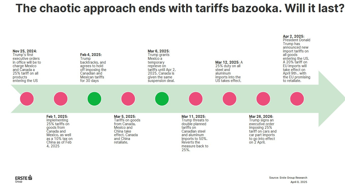 „Anunțul surprinzător al președintelui Trump că va reduce tarifele pentru aproape toate țările - cu excepția Chinei - la 10% pentru o perioadă de cel puțin 90 de zile a provocat euforie pe piețele bursiere. De fapt, tarifele mai mici justifică pentru moment o evaluare mai mare a claselor de active riscante decât nivelul tarifelor care a fost anunțat cu o săptămână mai devreme și a fost în vigoare doar pentru o zi. În același timp, însă, următoarele săptămâni și luni vor continua să fie caracterizate de un grad ridicat de incertitudine. Tarifele rămân la un nivel considerabil, conflictul comercial cu China continuă să se intensifice, iar moratoriul asupra tarifelor este valabil doar pentru 90 de zile. Aceasta înseamnă că povara globală asupra economiei rămâne considerabilă”, conform economiștilor Erste.