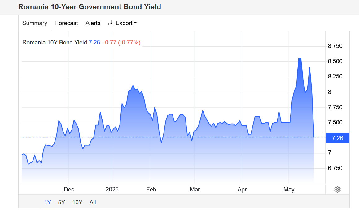 Și dobânzile la care România se împrumută de pe piețele externe s-au redus după cel de-al doilea tur al alegerilor prezidențiale. Astfel, în timpul zilei de luni, randamentul titlurilor de stat românești cu maturitate de 10 ani scăzuse la 7,26%, aproape de minimul acestui an.