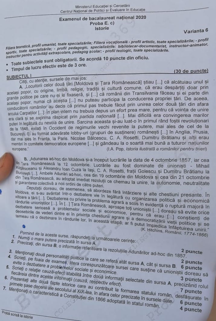 Subiectele de la Istorie pe care le-au avut de rezolvat în această dimineață absolvenții de la Uman și Pedagogic sunt cele de mai jos. Elevii au avut la dispoziție 3 ore pentru a rezolva subiectele la Istorie. Baremul la Istorie va fi făcut public în jurul orei 15:00.