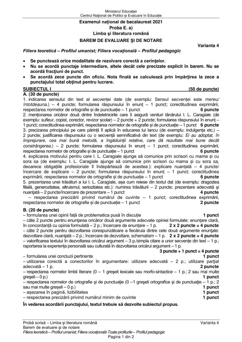 Bacalaureat 2021. Barem de corectare. Cum trebuiau rezolvate subiectele la limba și literatura română