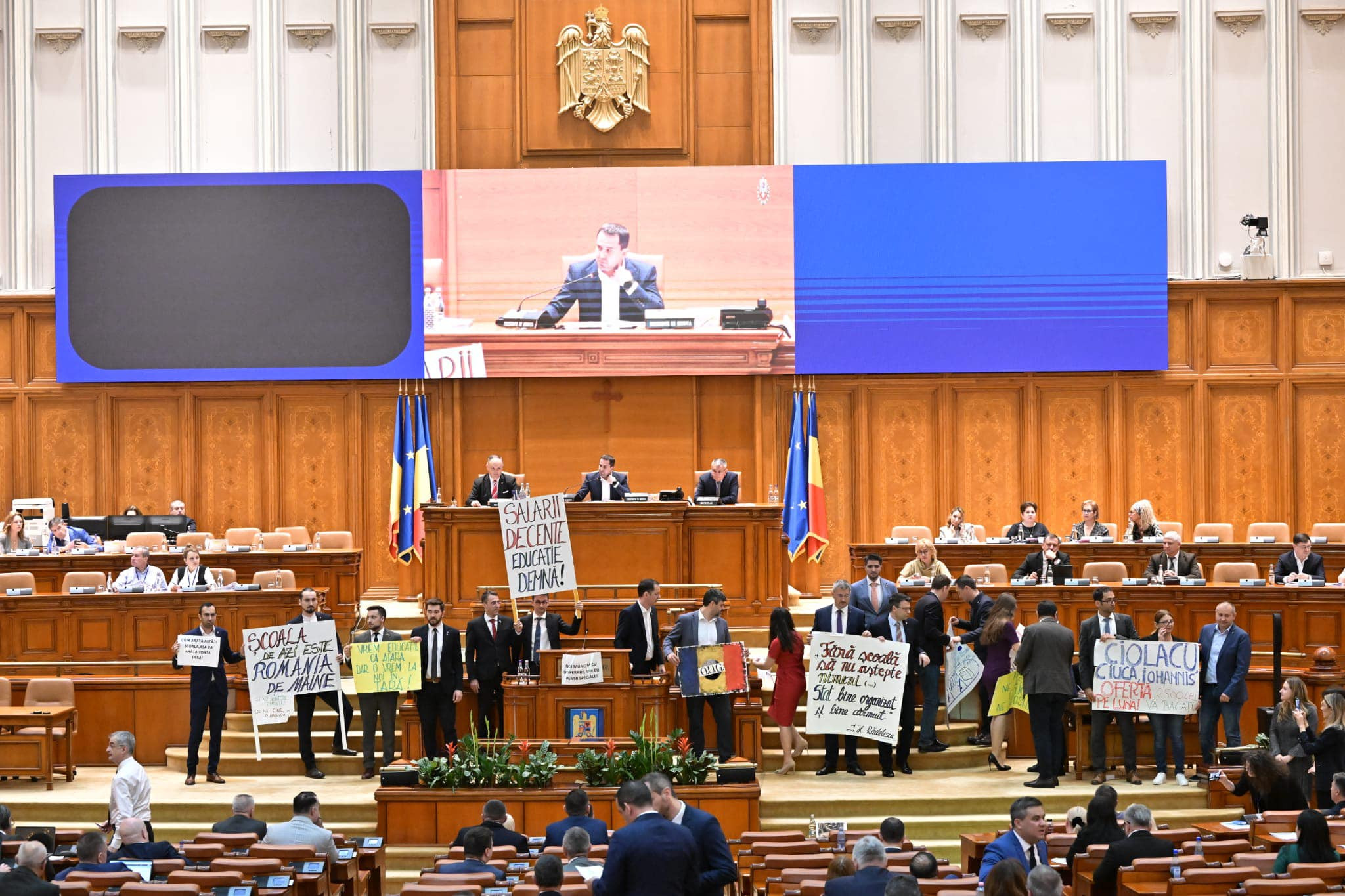 Greva din învățământ „mutat” în Parlament după ce mai mulți deputați USR au adus pancartele profesorilor în plenul Camerei Deputaților. Inițiatorii vor să atragă atenția membrilor din coaliția de guvernare și să le transmită că cerințele cadrelor didactice privind majorările salariale nu sunt deloc de neglijat.