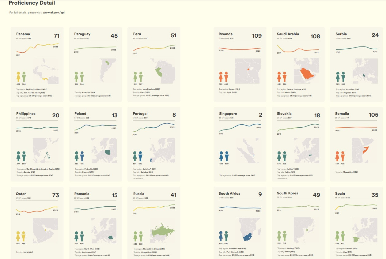 La polul opus, însă, țări precum Polonia (locul 13), Austria (locul 3) și Singapore (locul 2) au dovedit aptitudini mai bune în ce privește folosirea limbii engleze decât românii.