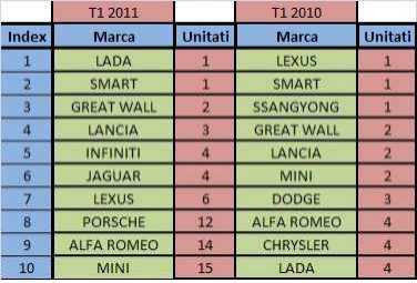 Cea mai mare scadere in clasament a inregistrat-o marca Lada, in timp ce Smart si-a mentinut pozitia de acum un an.