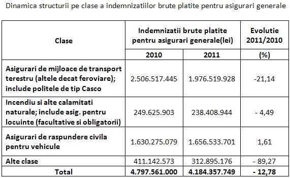 Defalcat, indemnizatiile brute platite in baza contractelor de asigurari generale s-au ridicat la aproximativ 4,2 miliarde lei, valoare in scadere cu 12,78% comparativ cu 2010. Printre cele mai mari scaderi pe acest segment le-au inregistrat companiile Platinum (-66%), FATA Asigurari (-65%), Eureko (-36%), Allianz-Tiriac (-24%) si BCR Asigurari, respectiv Asirom (-19%). Au existat si companii care au platit insa mai mult asiguratilor, precum Carpatica (+22%) sau Astra (+16%). In acelasi timp, nivelul indemnizatiilor brute si maturitatilor aferente asigurarilor de viata au totalizat peste 656 milioane lei, inregistrand o scadere de 2,6% fata de anul anterior (673 milioane lei).
