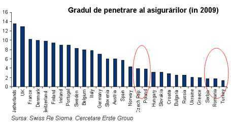 Majoritatea tarilor din Europa Occidentala raporteaza rate de penetrare a asigurarilor de 6-10% (adica ponderea veniturilor din primele de asigurari in total PIB),Olanda si Marea Britanie conducand detasat. Pe de alta parte, regiunea ECE ofera o imagine mai complexa: unele piete, cum ar fi Turcia, Romania si Serbia, inregistreaza rate de penetrare a asigurarilor sub 2%, in timp ce pe pietele dezvoltate precum Cehia, minim 4% din PIB provine din veniturile din prime de asigurari.